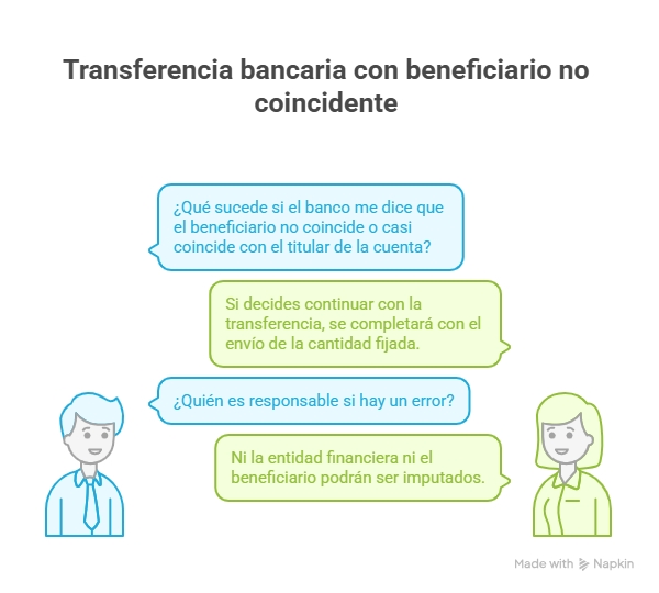 Si el sistema de verificación del banco te comunica que la persona beneficiaria es no coincidente o casi coincidente con el titular de la cuenta, y aun así decides continuar con la transferencia, la operación se completará con el envío de la cantidad fijada. En caso de error, no se les podrá imputar ni a la entidad financiera ni al beneficiario.