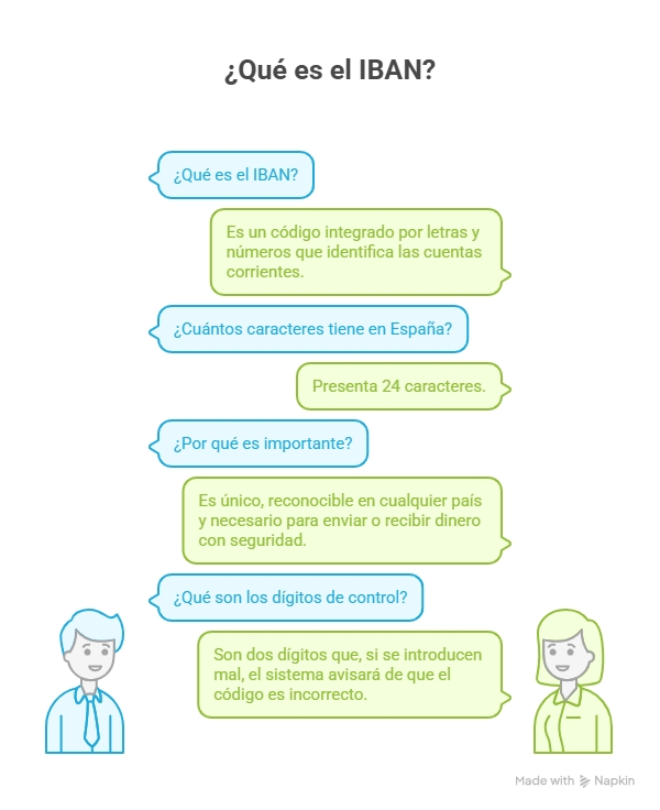 El IBAN es un código integrado por letras y números que identifica las cuentas corrientes. En España presenta 24 caracteres y viene a ser como el DNI de una cuenta: es único, reconocible en cualquier país, ya que responde a un estándar internacional, y necesario para enviar o recibir dinero con seguridad. Entre los mencionados veinticuatro caracteres se incluyen dos dígitos de control. Esto quiere decir que, si se introduce mal cualquiera de los dígitos del IBAN, el sistema avisará de que el código introducido es incorrecto, reduciéndose por ello las posibilidades de equivocarse al teclearlo.