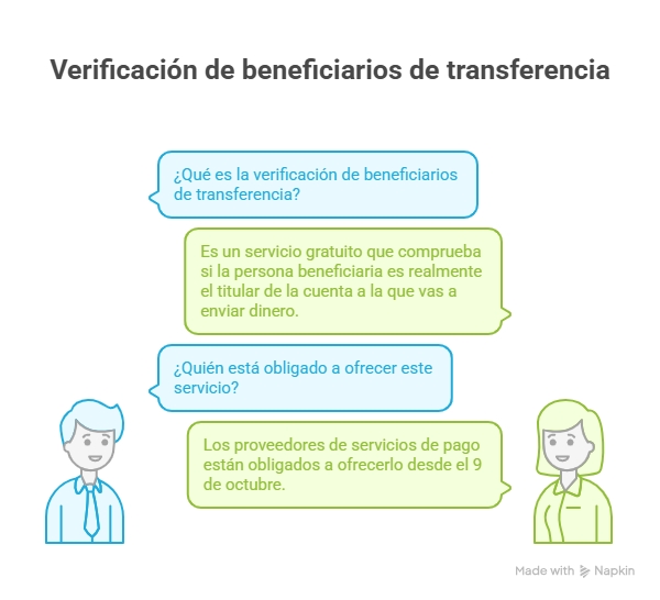 Por ello, los proveedores de servicios de pago están obligados a ofrecer desde el pasado 9 de octubre un servicio de verificación gratuito que permite comprobar si la persona beneficiaria a la que quieres hacer una transferencia es realmente el titular de la cuenta a la que vas a enviar el dinero.