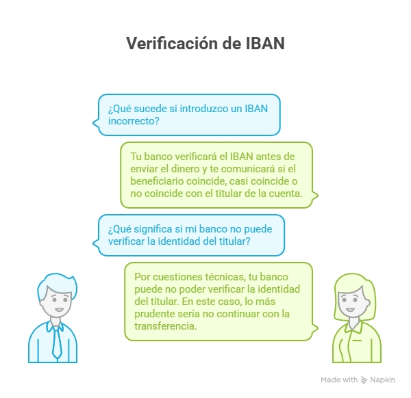 Este servicio de verificación consiste en que, una vez que has introducido el código IBAN y antes de que se envíe el dinero, tu entidad te comunicará –incluso en los casos en los que la cuenta de destino tenga varios cotitulares– si el beneficiario de la transferencia que has indicado resulta coincidente, casi coincidente o no coincidente con el titular de la cuenta, con diversas leyendas explicativas como, por ejemplo, “el nombre que has introducido no coincide con el titular de la cuenta”. También puede ocurrir que tu banco te indique que, por cuestiones técnicas, no se pudo verificar la identidad del titular, en cuyo caso, lo más prudente sería que no siguieses adelante con la transferencia.