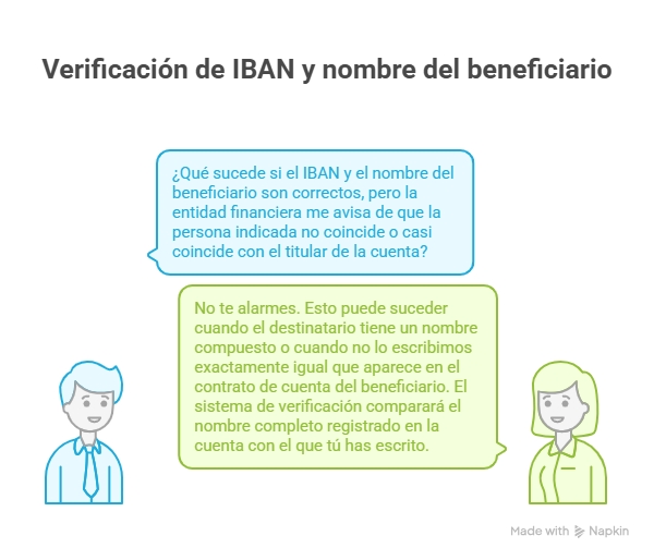 Con todo, también podría suceder que, aun habiendo introducido correctamente el IBAN y el nombre del beneficiario, la entidad financiera te avisara de que la persona indicada resulta no coincidente o casi coincidente con el titular de la cuenta. No te alarmes. Esto puede suceder, por ejemplo, cuando el destinatario es tu amigo “José”, pero que en el banco está identificado con su nombre completo: “José Luis”. El sistema de verificación comparará el nombre completo registrado en la cuenta con el que tú has escrito. Como no coincide plenamente, te mostrará la advertencia. Es normal que surjan estos avisos cuando el destinatario tiene un nombre compuesto o cuando no lo escribimos exactamente igual que aparece en el contrato de cuenta del beneficiario, ya que las entidades financieras se basan en los datos facilitados contractualmente por su cliente para realizar la verificación.