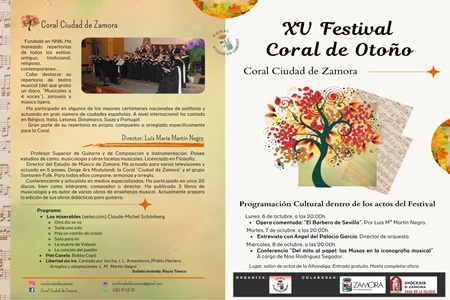 El Festival Coral de Otoño alcanza este año su XV edición con una propuesta musical que incluye la participación de la Coral Polifónica de Santa Cristina de la Polvorosa, de Zamora, la Coral del Milenario de San Salvador de la Bañeza, de León, y de la Coral Ciudad de Salamanca.